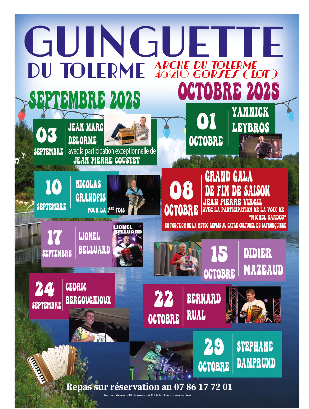 Chaque année de fin avril à mi octobre, l'arche du Tolerme s'anime tous les mercredis de 14h à 22h. Une guinguette chaque mercredi qui reçoit des artistes pour vous faire danser sur des airs de musette. Demandez le programme!